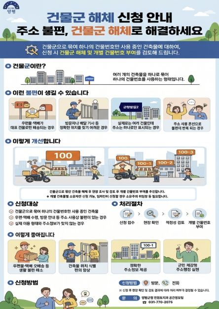미디어라이프 중부신문 최부일 기자 | 양평군은 건물군으로 묶여 하나의 건물번호만 사용하고 있는 건축물을 대상으로 건물군 해체 및 개별 건물번호 부여를 추진해 군민의 주소 사용 불편을 해소할 계획이라고 밝혔다. 이번 사업은 국민불편사항 개선 과제의 일환으로 추진되며, 실제 이용 형태와 맞지 않는 주소 체계를 정비해 보다 정확한 주소 사용 환경을 조성하기 위해 마련됐다.