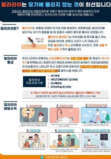 또 국내·외 말라리아 위험지역 방문 후 말라리아 의심 증상(발열, 오한, 두통 등)이 발생하면 즉시 고양시 우리 동네 말라리아 진단기관이나 주민등록지 관할 보건소를 방문해 검사를 받아야 한다.