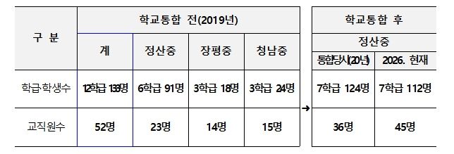 정산중학교는 1952년 개교 이후, 2020년 인근 청남중학교와 장평중학교를 통합해 기숙형 중학교로 재편·운영 중이다. 해당 학교는 통합 후 우수한 교육환경을 바탕으로 체계적인 교육과정을 운영하고 다양한 교육 프로그램을 제공함으로써 작은학교 혁신의 대표적 우수사례로 평가받고 있다.