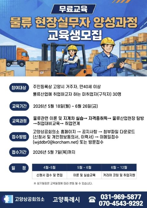 미디어라이프 중부신문 최부일 기자 | 고양특례시는 2026년 고양맞춤형 일자리학교 공모에 선정된 ‘물류 현장실무자 양성과정’에 참여할 교육생을 오는 5월 7일까지 모집한다.