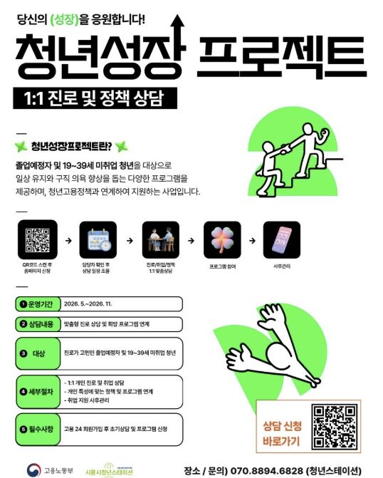 참여 신청은 청년스테이션 현장 또는 ‘고용24’ 누리집 내 청년성장프로젝트 페이지를 통해 가능하다. 프로그램은 5월부터 전문 상담사의 1대1 진단을 바탕으로 개인별 맞춤형 과정으로 운영된다.