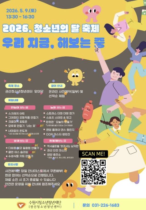 미디어라이프 중부신문 이종인 기자 | 수원시청소년청년재단 권선청소년청년센터가 오는 5월 9일, 청소년이 주인공이 되어 직접 경험하고 도전하는 참여형 축제 ‘지금우리, 해보는중’을 개최한다고 밝혔다.