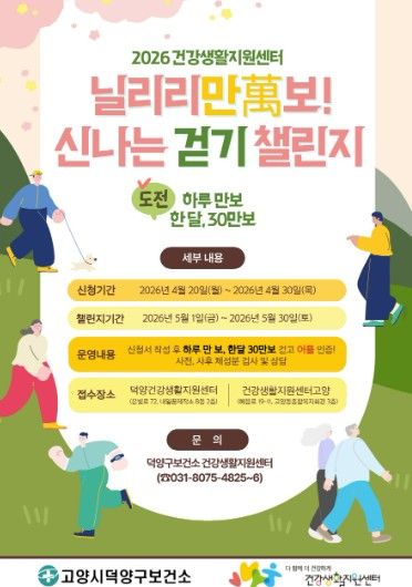 미디어라이프 중부신문 최부일 기자 | 고양특례시 덕양구보건소 건강생활지원센터는 지역주민의 건강생활 실천 확산을 위한 생활밀착형 걷기 프로그램 ‘2026 닐리리만보 걷기 챌린지’를 오는 5월부터 운영을 시작한다.