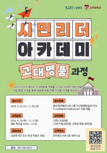 미디어라이프 중부신문 김민정 기자 | 남양주시는 시민의 자치 역량 강화를 위해 ‘남양주시 시민리더 아카데미’ 제20기 수강생을 모집한다고 22일 밝혔다.