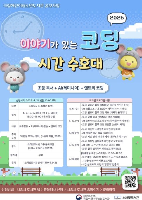 미디어라이프 중부신문 이종인 기자 | 시흥시 소래빛도서관은 국립어린이청소년도서관이 주최하는 ‘2026년 이야기가 있는 코딩’ 공모사업 운영기관으로 선정돼 오는 5월 6일부터 어린이 대상 독서·디지털 융합 프로그램을 운영한다.