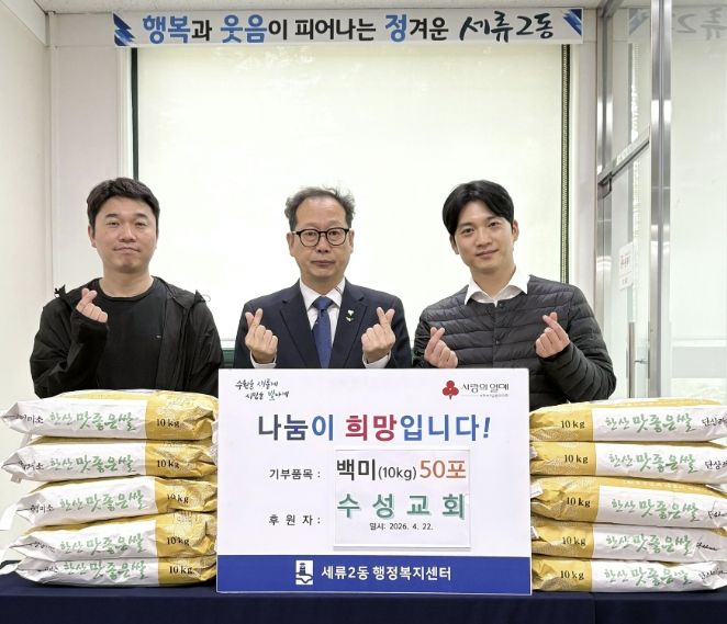 세류2동 변영호 동장은 “매년 잊지 않고 사랑 나눔을 실천해 주신 수성교회에 감사드리며, 앞으로도 민·관 협력을 통해 행복과 웃음이 피어나는 정겨운 세류2동을 만들어가겠다”고 말했다.