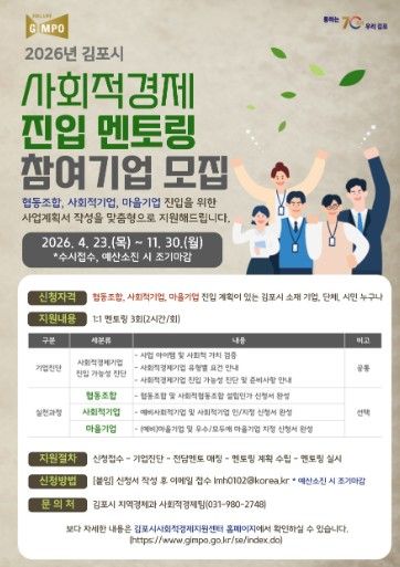 미디어라이프 중부신문 최부일 기자 | 김포시는 협동조합, 사회적기업, 마을기업 등 사회적경제기업 진입을 지원하기 위해 ‘2026년 김포시 사회적경제 진입 멘토링’ 참여기업을 오는 11월 30일까지 수시 모집한다.