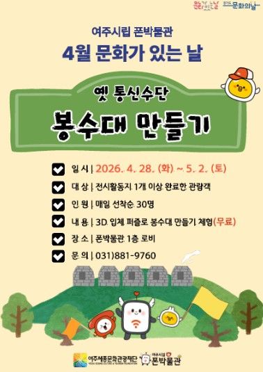 미디어라이프 중부신문 최부일 기자 | 여주세종문화관광재단이 운영하는 여주시립 폰박물관은 4월 '문화가 있는 날'을 맞아 오는 4월 28일부터 5월 2일까지 시민 참여형 체험 행사 '소식을 전하던 봉수대 만들기'를 운영한다.