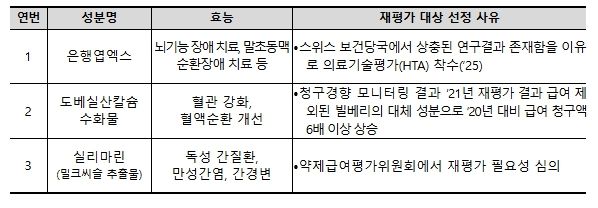 개편 평가체계에 따라 2026년도 평가 대상으로 은행엽엑스, 도베실산칼슘수화물, 실리마린(밀크씨슬 추출물) 총 3개 성분이 선정됐으며, 구체적 선정 사유는 아래와 같다.