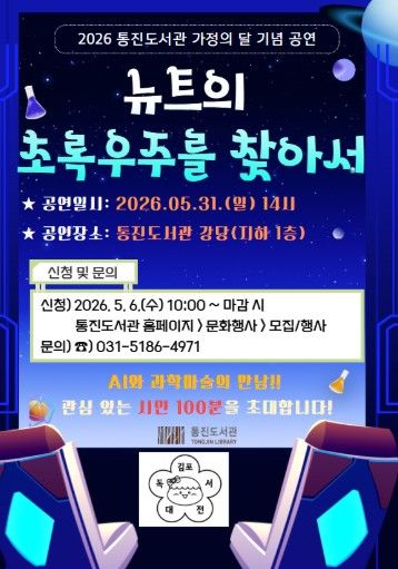 미디어라이프 중부신문 최부일 기자 | 김포시 통진도서관이 가정의 달을 맞아 온 가족이 함께 즐길 수 있는 공연 '뉴트의 초록우주를 찾아서'를 오는 5월 31일 오후 2시 통진도서관 강당에서 개최한다.