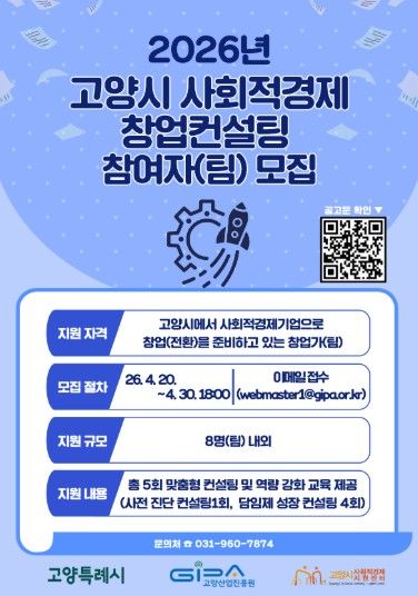 미디어라이프 중부신문 최부일 기자 | 고양산업진흥원이 운영하는 고양시사회적경제지원센터가‘2026년 고양시 사회적경제 창업컨설팅 사업’에 참여할 예비 창업자(팀)을 오는 30일까지 모집한다.