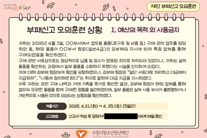 미디어라이프 중부신문 이종인 기자 | 수원시청소년청년재단은 임직원의 부패 상황 인지 및 신고 역량을 강화하고 조직 내 청렴문화를 확산하기 위해 '2026년 부패신고 모의훈련'을 실시했다고 밝혔다.