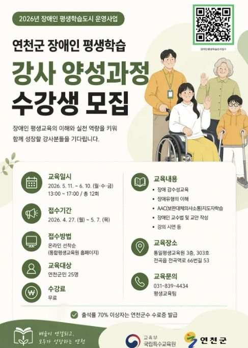 미디어라이프 중부신문 최부일 기자 | 연천군은 교육부 국립특수교육원이 주관하는 '2026년 장애인 평생학습도시 운영 지원사업' 공모에 선정됨에 따라 장애인 평생교육 현장형 강사 양성 과정을 운영한다.