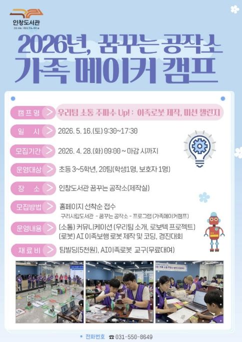 미디어라이프 중부신문 최부일 기자 | 구리시 인창도서관‘꿈꾸는 공작소’는 오는 5월 16일 초등학생 자녀와 보호자가 함께 참여해 가족 간 유대감을 높이고 인공지능을 체험하는 '우리 팀 소통 주파수 Up! : 이족로봇 제작, 미션 챌린지' 가족 메이커 캠프를 운영한다고 밝혔다.