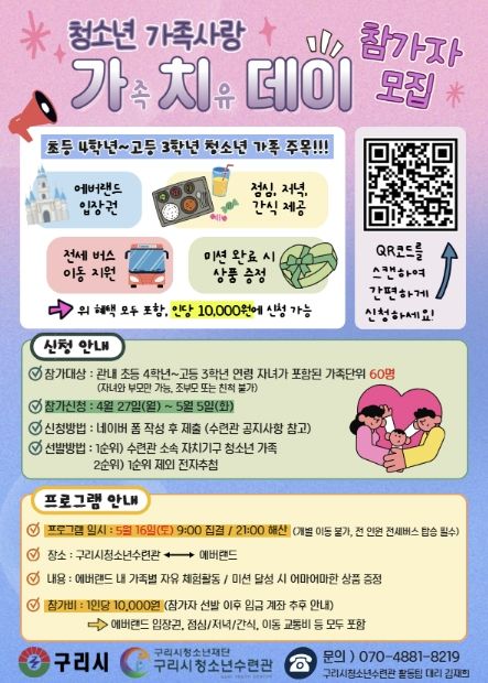 모집 대상은 구리시 관내 초등학교 4학년부터 고등학교 3학년까지의 자녀를 포함한 가족 총 60명이다. 참가자 전원에게는 에버랜드 자유이용권을 비롯해 식사와 간식, 전세버스 이동 지원 등이 제공된다.