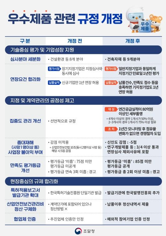 미디어라이프 중부신문 이건영 기자 | 조달청은 기업의 성장을 지원하고, 공정한 경쟁환경을 조성하기 위해 우수조달물품 관련 규정을 개정하여 4월 27일부터 시행한다고 밝혔다.