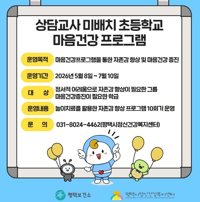 미디어라이프 중부신문 이종인 기자 | 평택시는 상담교사가 배치되지 않은 초등학교 학생들의 정신건강 지원을 위해 ‘마음건강 프로그램’을 운영한다고 밝혔다.