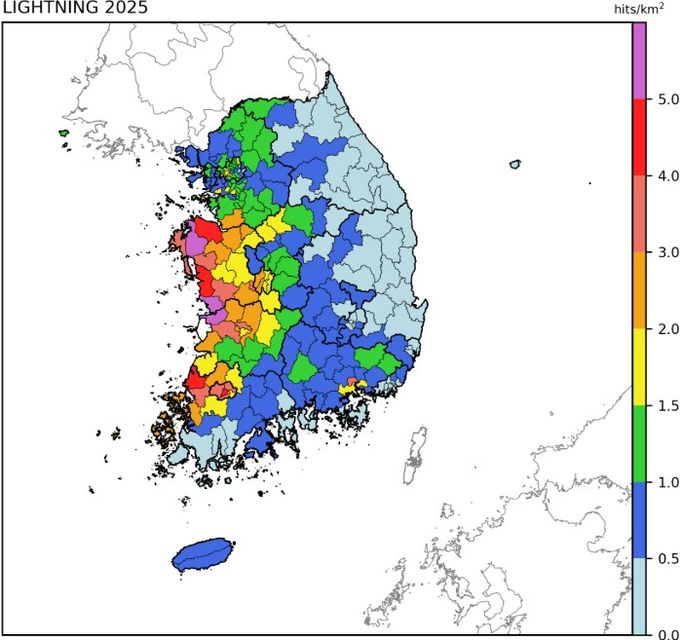 미디어라이프 중부신문 이도경 기자 | 기상청은 2025년 우리나라에서 관측된 낙뢰 정보를 담은 ‘2025 낙뢰연보’를 발간했다. 연보는 기상청 21개 낙뢰 관측망으로 관측한 자료를 통해 분석한 △월별, 광역시·도별, 시군구별 낙뢰 횟수 △단위 면적당(㎢) 횟수 △낙뢰 공간 분포 △주요 5대 낙뢰 사례 등의 내용을 담고 있다.