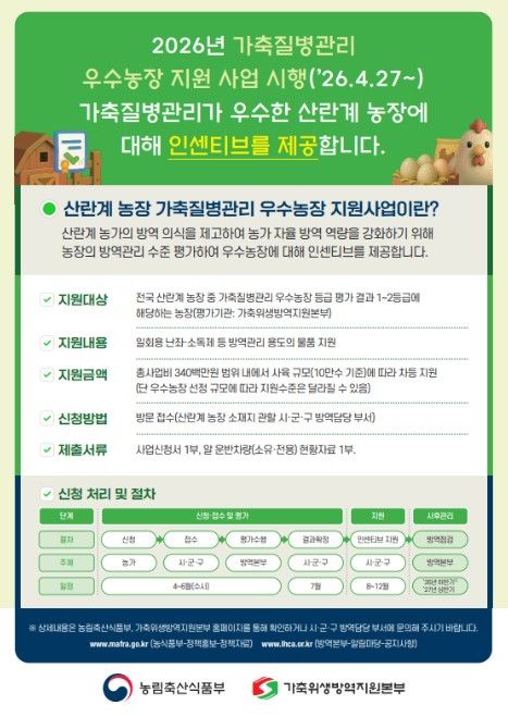미디어라이프 중부신문 이도경 기자 | 농림축산식품부는 축산농가의 방역역량을 강화하고 가축전염병 발생을 사전 예방하기 위해 '가축질병관리 우수농장 지원사업'을 2026년 4월부터 본격 추진한다고 밝혔다.