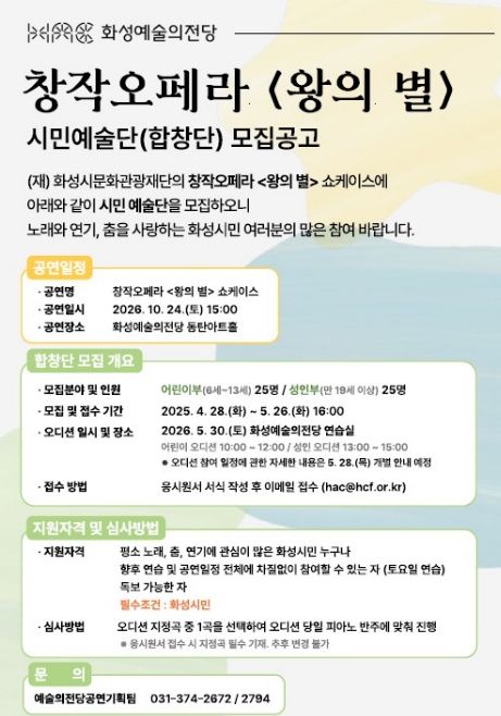 미디어라이프 중부신문 이종인 기자 | (재)화성시문화관광재단은 오는 10월 개최 예정인 창작오페라 '왕의 별' 쇼케이스 무대에 참여할 시민합창단을 모집한다.
