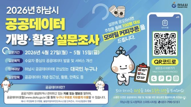 미디어라이프 중부신문 최부일 기자 | 하남시는 시민과 기업, 연구기관 등 다양한 수요자의 의견을 반영해 공공데이터 개방 및 활용을 확대하고자 ‘2026년 하남시 공공데이터 설문조사’를 실시한다고 밝혔다.