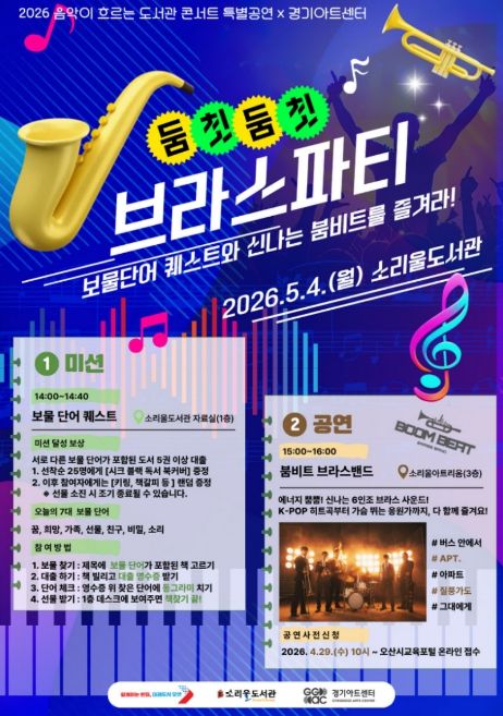 미디어라이프 중부신문 이종인 기자 | 오산시 소리울도서관은 제104회 어린이날을 앞둔 오는 5월 4일 경기아트센터와 협업해 ‘2026 음악이 흐르는 도서관 콘서트’ 특별공연인 ‘둠칫둠칫 브라스 파티’를 개최한다고 밝혔다.