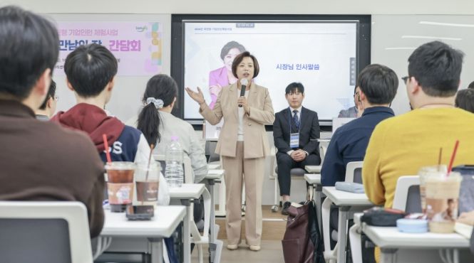 기업인턴 체험 사업 참여기업과 인턴 지원자 간 상호 이해를 높이기 위해 마련된 이날 간담회에는 ‘금강공업’, ‘이트너스㈜’, ‘플렉스온 주식회사’ 등 참여기업 관계자 11명과 인턴 지원자 39명 등 총 50여 명이 참석했다.