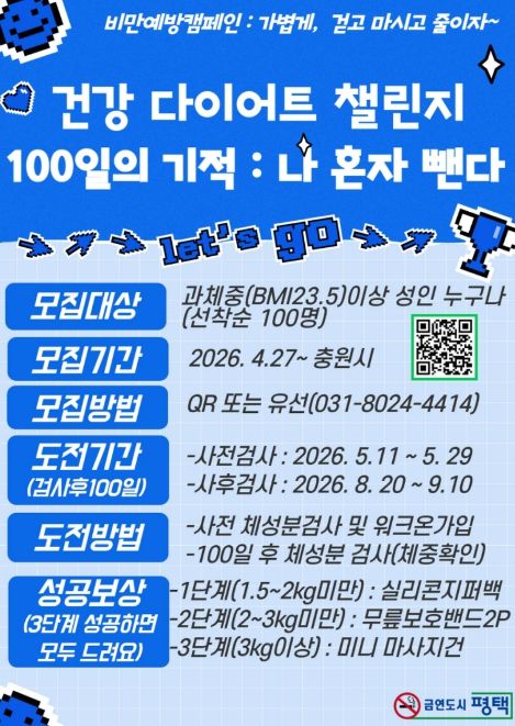 미디어라이프 중부신문 이종인 기자 | 평택시는 시민들이 스스로 비만 관리 능력을 키우고 건강한 생활 습관을 정착시킬 수 있도록 돕는 비만 예방 프로그램 '100일의 기적’참가자를 모집한다고 밝혔다.