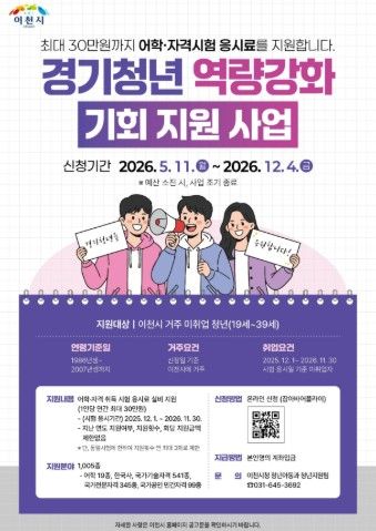 미디어라이프 중부신문 최부일 기자 | 이천시가 오는 5월 11일부터 미취업 청년의 어학·자격시험 응시료를 지원하는 ‘경기청년 역량강화 기회지원 사업’ 대상자 모집에 들어간다.
