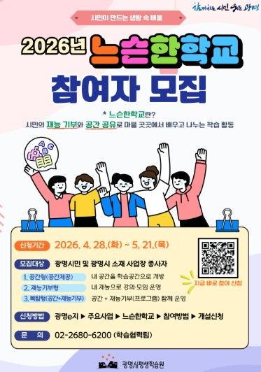 미디어라이프 중부신문 이종인 기자 | 광명시가 시민이 직접 가르치고 배우는 시민참여형 평생학습 프로그램 ‘느슨한학교’ 신규 운영자를 오는 5월 21일까지 모집한다.