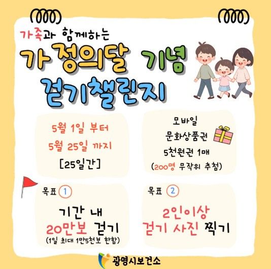 미디어라이프 중부신문 이종인 기자 | 광명시가 오는 5월 가정의 달을 맞아 시민 건강을 증진하고 가족 유대를 강화하고자 ‘2026년 가정의 달 기념 걷기 챌린지’를 운영한다.