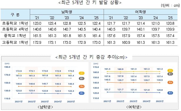 키 발달 상황을 보면, 남학생의 경우 초등학교 1학년은 122.4cm, 4학년은 140.4cm, 중학교 1학년은 161.4cm, 고등학교 1학년은 173.0cm이다. 여학생의 경우 초등학교 1학년은 120.8cm, 4학년은 139.9cm, 중학교 1학년은 157.4cm, 고등학교 1학년은 161.3cm로 남·여 학생 모두 이전 연도와 유사했다.