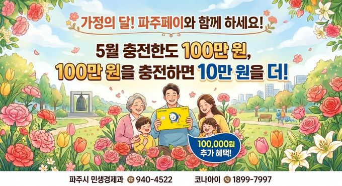 미디어라이프 중부신문 최부일 기자 | 파주시는 5월 가정의 달을 맞아 5월 1일부터 5월 31일까지 한 달간 지역화폐 파주페이의 월 충전한도를 기존 70만 원에서 100만 원으로 상향한다.