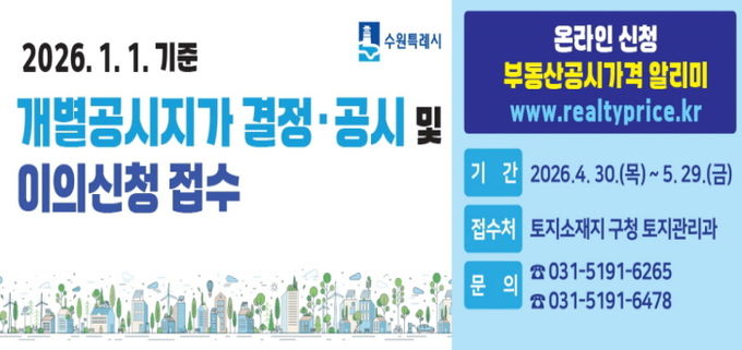 미디어라이프 중부신문 이종인 기자 | 수원시 권선구는 4월 30일 결정·공시되는 개별공시지가에 대해 4월 30일부터 5월 29일까지 이의신청을 접수한다고 밝혔다.