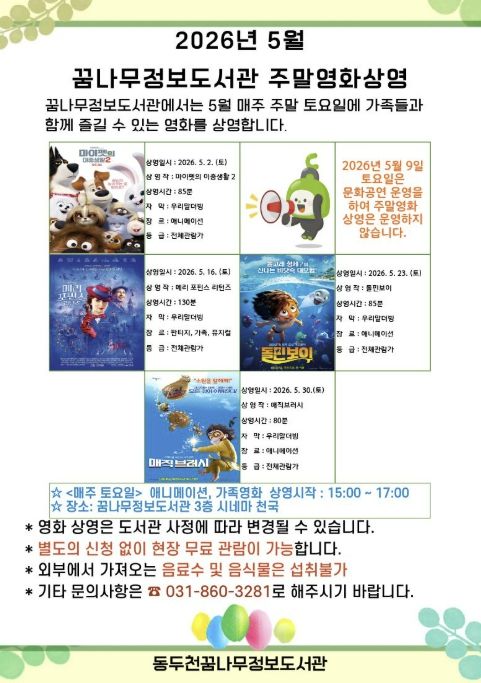 미디어라이프 중부신문 최부일 기자 | 동두천시 도서문화사업소 정보도서관에서는 오는 5월 매주 토요일 어린이와 가족을 위한 애니매이션 및 가족영화 4편을 상영한다고 밝혔다.