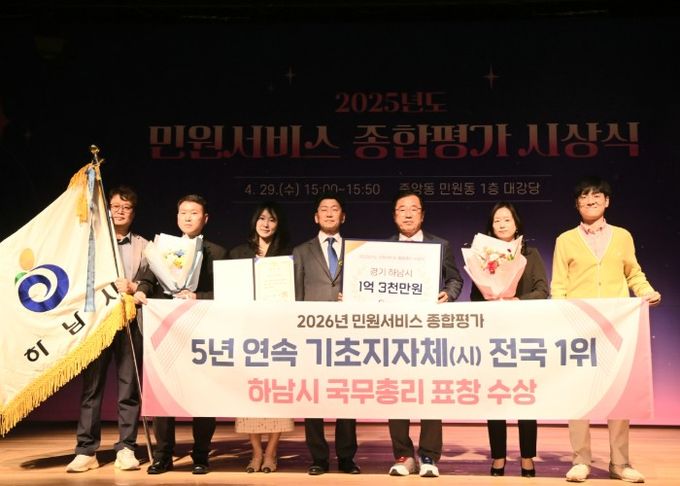 미디어라이프 중부신문 최부일 기자 | 하남시가 전국 기초자치단체 중 최고 수준의 민원서비스 역량을 인정받으며 5년 연속 최우수 기관으로 선정됐다. 하남시는 29일 정부세종청사에서 열린 ‘2025년 민원서비스 종합평가’ 우수기관 시상식에서 국무총리 표창을 수상했다고 밝혔다.