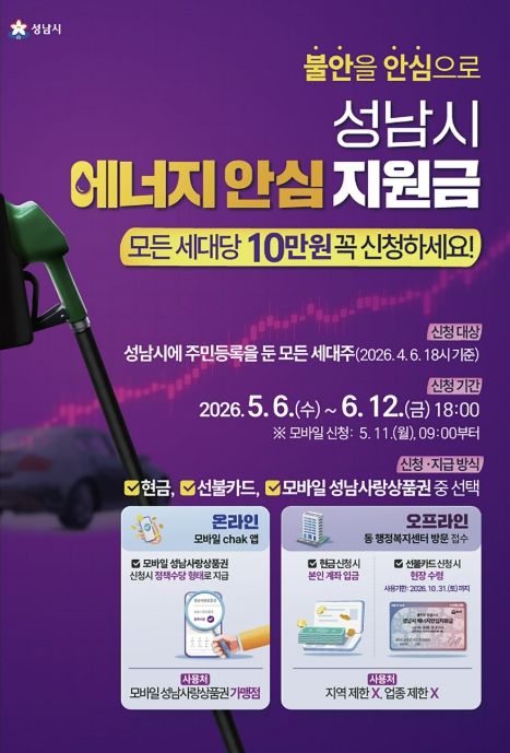 미디어라이프 중부신문 이종인 기자 | 성남시는 중동 사태에 따른 국가 자원안보 위기 경보 발령으로 경제적 부담이 커진 시민들을 지원하기 위해 전국 최초로 ‘성남시 에너지 안심지원금’을 오는 5월 6일부터 신청을 받는다고 밝혔다.