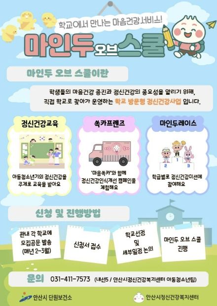 미디어라이프 중부신문 이종인 기자 | 안산시 정신건강복지센터는 11월까지 관내 초·중·고등학교 총 10개교를 대상으로 학교로 찾아가는 정신건강사업 ‘마인두 오브 스쿨’을 운영한다고 30일 밝혔다.
