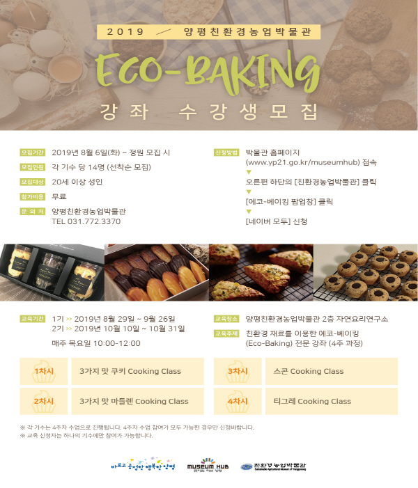 20세 이상의 성인을 대상으로 ‘친환경 재료’로 만들어보는 베이킹 수업은 총 2기로 나누어 실시되며 오는 29일부터 10월 31일까지 매주 목요일 오전 10시부터 12시까지 2시간동안 쿠키, 스콘, 마들렌, 티그레 등을 만들어보는 4회차 수업으로 진행된다.