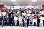 미디어라이프 중부신문 이도경 기자 | 새마을문고양주시지부가 최근 양주시청 대회의실에서 ‘제23회 양주시장기 시민독서경진대회’ 시상식을 성황리에 개최했다. 이날 시상식에는 강수현 양주시장, 윤창철 양주시의회의장, 임정모 동두천양주교육지원청 교육장, 권용주 심사위원장, 권중진 양주시새마을회장, 이종용 새마을지도자양주시협의회장, 김경란 양주시새마을부녀회장 등 주요 내빈과 새마을문고 임원 및 지도자, 수상자와 가족 등 100여 명이 참석해 자리를 빛냈다. 이번 대회는 제45회 대통령기 국민독서경진 양주시 예선대회와 병행하여 진행됐으며, 개인부문 최우수상은 ▲문재희(주원초) ▲용예솔(만송초) ▲임라희(유정글로벌) ▲김나윤(경민고) ▲김혜진(일반부) ▲연성호 하사(특별부) ▲정서후(편지글 학생부) ▲김승자(편지글 일반부) ▲김서율(시화 학생부) ▲이상미(시화 일반부)가 각각 수상의 영예를 안았다. 오경옥 회장은 대회사에서 '책 읽는 우리는 아릅답다' 라는 주제로 책을 읽고 쓰고 전달하고. 함께 생각을 나누다 보면 세상을 바라보는 따뜻한 눈을 가질 수 있다고 말하며 “독서는 문화의 기본인 만큼 함께 읽고, 쓰고, 나