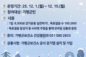 미디어라이프 중부신문 이종인 기자 | 가평군보건소가 공식 걷기앱 ‘워크온’을 기반으로 올해 1월부터 매월 다양한 걷기 프로그램을 운영하며 군민들로부터 호응을 얻고 있다. 보건소는 걷기 실천 문화 확산과 비만 예방을 목표로 아동‧청소년부터 성인‧어르신에 이르기까지 생애주기별 맞춤형 프로그램을 지속적으로 제공해 왔다. 특히 ‘클린 더 가평’, ‘금연 쓰담달리기(플로깅)’, ‘가평군 캐릭터 잡기’, ‘건강증진 4행시 챌린지’ 등 걷기와 연계한 활동을 도입해 참여자들의 성취감을 높였다는 평가다. 보건소는 이러한 활동이 주민들의 운동 동기를 높이는 데 효과적인 방식이라고 설명했다. 가평군보건소는 12월 1일부터 15일까지 군민을 대상으로 올해 마지막 걷기 프로그램을 운영한다. 참여자는 하루 8,000보 걷기와 총 10만 보 달성을 목표로 하며, 목표를 달성한 주민 중 400명을 추첨해 모바일 상품권을 지급한다. 참여를 위해서는 가평군보건소 공식 걷기앱 설치 및 가입이 필요하다. 자세한 문의는 가평군보건소 건강증진과로 하면 된다. 보건소 관계자는 “다가오는 2026년에도 군민들이 걷기운동을 생활 속에서 실천할 수 있도