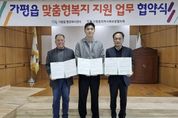 미디어라이프 중부신문 이종인 기자 | 가평군 가평읍 행정복지센터는 최근 가평읍지역사회보장협의체(지사협), 유일닭강정과 ‘맞춤형복지 지원 업무협약’을 체결했다. 이번 협약으로 유일닭강정은 매월 가평읍 맞춤형복지팀에서 추천한 저소득계층 10가정에 닭강정을 지원해 주기로 했다. 장석조 가평읍장은 “복지사각지대 발굴뿐 아니라 민간 자원 연계가 복지 수준을 높이는 데 큰 역할을 한다”며 “이번 협약이 공공자원만으로는 충족하기 어려웠던 복지수요를 보완하는 데 큰 도움이 될 것”이라고 말했다. 유병훈 유일닭강정 대표는 “우리 지역 주민들과 마음을 나누고 싶어 맞춤형복지 지원 협약에 참여했다”며 “앞으로도 어려운 이웃을 위한 나눔과 봉사를 꾸준히 실천하겠다”고 밝혔다.