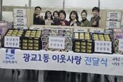 미디어라이프 중부신문 이종인 기자 | 영통구 광교1동은 지난 2월 11일, 설 명절을 앞두고 관내 단체와 기관의 따뜻한 나눔이 이어지는 가운데 ‘설 명절 이웃나눔 전달식’을 개최했다고 밝혔다. 광교1동에 따르면, 이번 전달식에는 동남용역이 후원한 햄 40세트와 시립광교동어린이집에서 정성껏 준비한 생필품 꾸러미 40박스가 전달됐다. 또한 광교1동 지역사회보장협의체에서 마련한 후원금과 광교1동 공동모금회를 통해 준비된 떡국떡, 전, 나물, 과일 등 명절 음식도 함께 전달돼 뜻깊은 의미를 더했다. 특히 이번 나눔은 기업과 보육기관, 지역 복지단체가 한마음으로 참여해 설 명절을 앞두고 소외되기 쉬운 이웃들에게 따뜻한 정을 전하며 지역사회에 훈훈한 분위기를 조성했다. 광교1동은 이날 전달된 성금과 물품을 저소득 가정과 취약계층, 홀몸 어르신 등 도움이 필요한 이웃들에게 전달해 따뜻하고 풍성한 설 명절을 보낼 수 있도록 지원할 예정이다. 송숙영 광교1동장은 “설 명절을 맞아 어려운 이웃을 위해 소중한 정성을 모아주신 모든 분들께 깊은 감사의 말씀을 드린다”며, “전달받은 성금과 물품은 꼭 필요한 이웃들에게