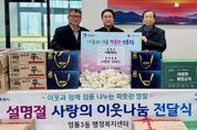 미디어라이프 중부신문 이종인 기자 | 수원특례시 영통구 영통3동은 지난 11일, 다가오는 설 명절을 맞아 관내 취약계층을 위한 이웃나눔 전달식을 진행했다. 이번 전달식은 설 명절을 맞아 경제적 어려움을 겪는 저소득층과 복지사각지대 이웃들이 따뜻한 명절을 보낼 수 있도록 마련됐다. 후원물품은 햄, 라면, 생필품 등 다양한 품목으로 구성됐으며, 관내 취약계층 200여 세대에 전달될 예정이다. 진성원 영통3동 단체협의회장은 “설 명절을 맞아 여러 기관이 뜻을 모아 지역 이웃들을 위한 나눔에 함께 참여했다. 각 기관의 정성이 모인 후원물품이 어려운 이웃들의 생활에 작은 보탬이 되길 바란다”고 전했다. 김인태 영통3동장은 “여러 기관이 함께해 주신 소중한 후원에 깊이 감사드린다. 전달된 후원물품은 도움이 필요한 이웃들에게 전달해 따뜻한 명절을 보낼 수 있도록 하겠다”고 말했다.
